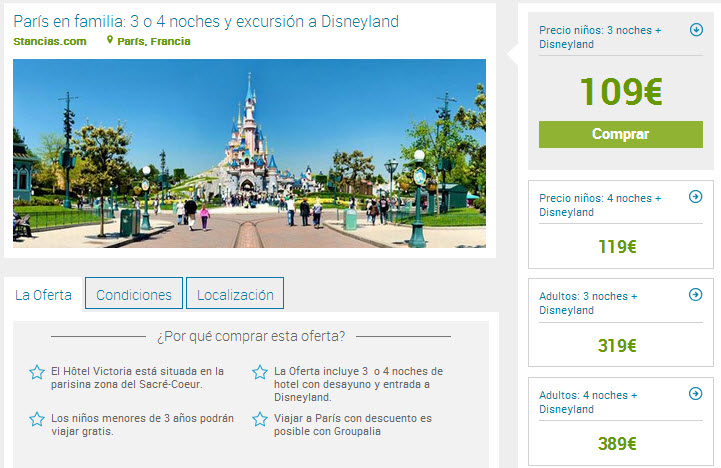 Uno de los destinos que personalmente más me gustan, porque suele ser recurrente en el portal Groupalia, es París, ya sea en la propia ciudad, o bien en Disneyland París, o, como en la oferta que me ha gustado y expongo en esta foto, un viaje conjunto: estancia en París y visita a Disneyland París.