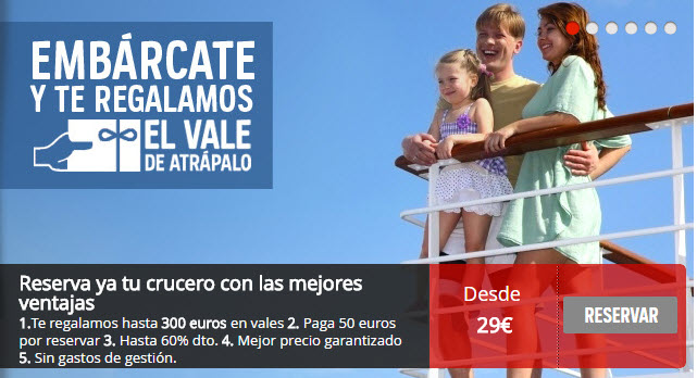 Lo bueno de esta promoción es que, aparte de no tener gastos de gestión, que pueden suponer hasta 50 euros en algunos casos, te regalan un vale de Atrapalo que puedes utilizar en lo que quieras: cenas, conciertos, espectáculos para niños, por lo que es más versátil que el saldo que te dan otras ofertas y que sólo puedes gastar dentro del crucero.