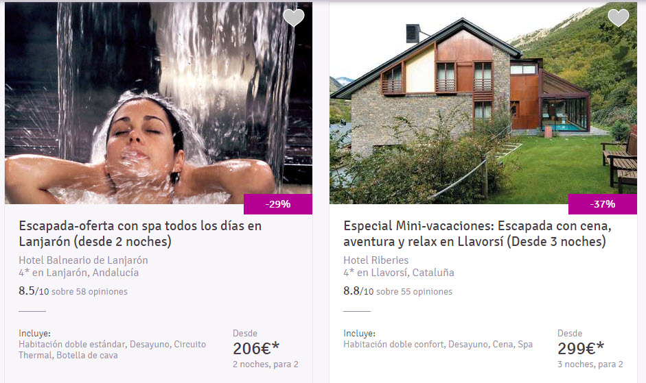 Por último, otra opción para regalar a tu pareja en este San Valentín son las escapadas a hoteles con spa y casas rurales, que puedes encontrar en portales como Weekendesk. Te pongo un ejemplo de ofertas que puedes encontrar ahora mismo: